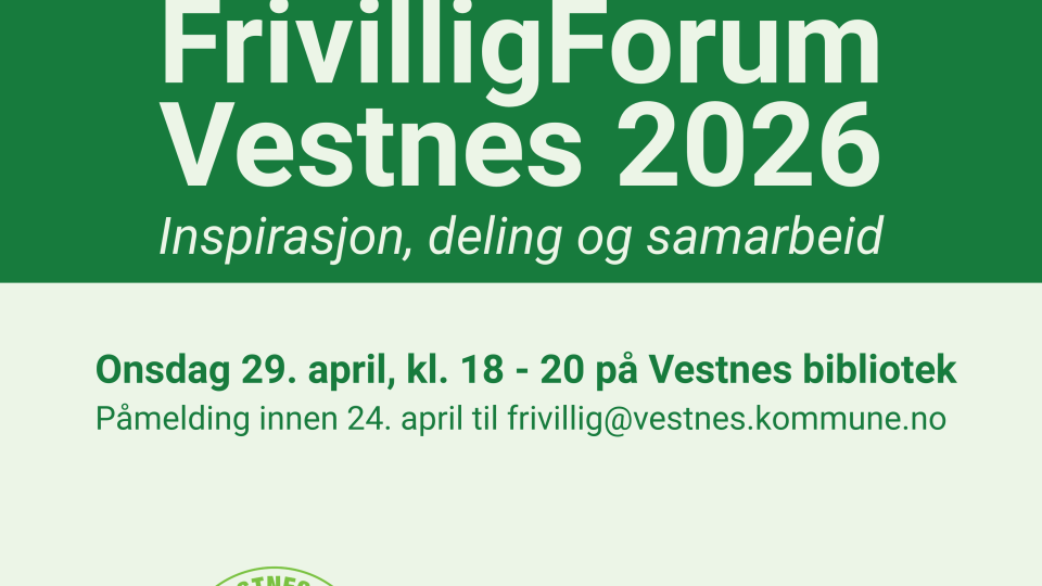 Frivillig Forum 2026 Vestnes frivilligsentral inviterer alle lag og organisasjonar i Vestnes kommune til Frivillig Forum 2026 Publisert 13.04.2026 kl. 11.20