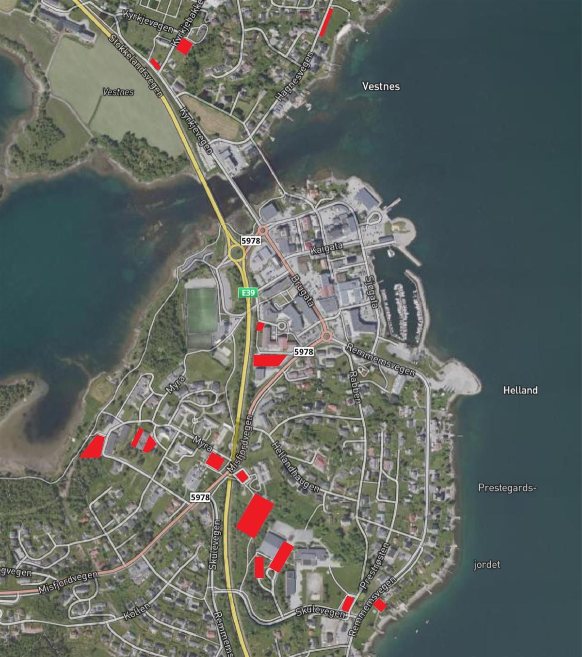 Kart over sentrum. Raude område viser tilrådde parkeringsareal under sjøsettinga.Ei lang rekke gode krefter