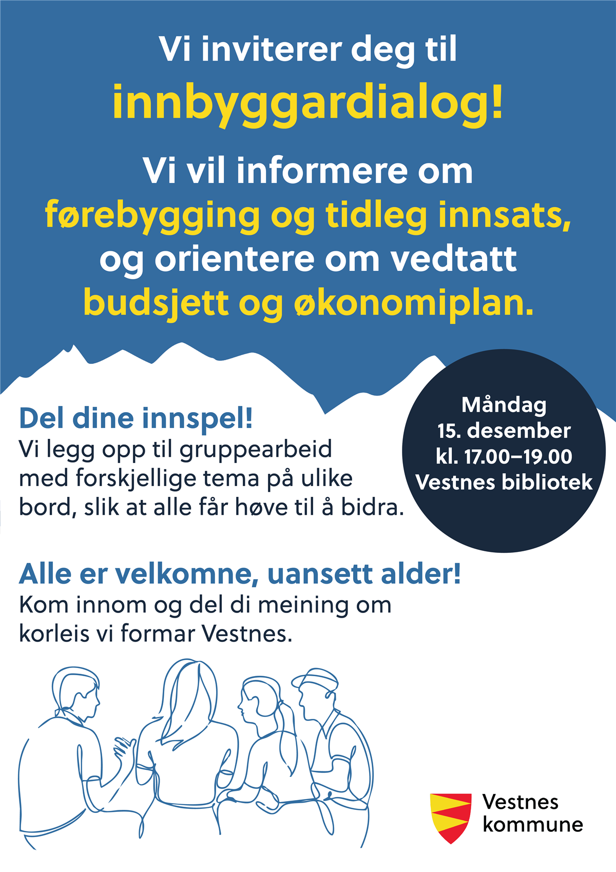 Vi inviterer deg til ny innbyggardialog! Måndag 15. desember kl. 17.00–19.00 Vestnes bibliotek. Målet med innbyggardialog er å informere om viktige prosessar og skape ein god dialog mellom kommunen og deg som bur her. Temaet for denne innbyggardialogen er førebygging og tidleg innsats. Det vil også bli informert kort om budsjett for 2026 og økonomi- og handlingsplan for 2026–2029. – Budsjettvedtaket som blir gjort av kommunestyret 11. desember gir oss eit oppdrag for dei neste fire åra. Vi ønskjer å involvere innbyggarane i korleis vi tenkjer å løyse desse oppgåvene best mogleg. Satsinga på førebygging og tidleg innsats i tråd med heilskapleg innsatstrapp blir heilt sentral, seier kommunedirektør Audhild Mork. Etter orienteringa blir det gruppearbeid med ulike tema på forskjellige bord. Her kan du kome med innspel som blir teke med i vurderinga når vi arbeider med omstilling. – Den første innbyggardialogen viste stort engasjement, og vi fekk mange gode innspel som vi tok med tilbake i arbeidet med omstilling. Oppsummeringa av gruppeabeidet ligg ute på heimsida. Vi håpar på like gode samtalar denne gongen, seier kommunedirektøren. Tid og stad:Måndag 15. desemberKl. 17.00–19.00Vestnes bibliotek Sist endra 27.11.2025 09.45